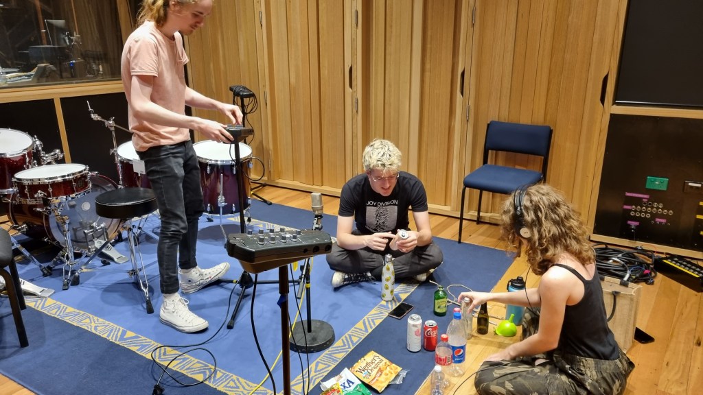 Our Musician wanted to use the sounds of plastic, glass and mental objects (common recyclable objects) to make a soundscape with. We took some items into the recording studios and got creative.