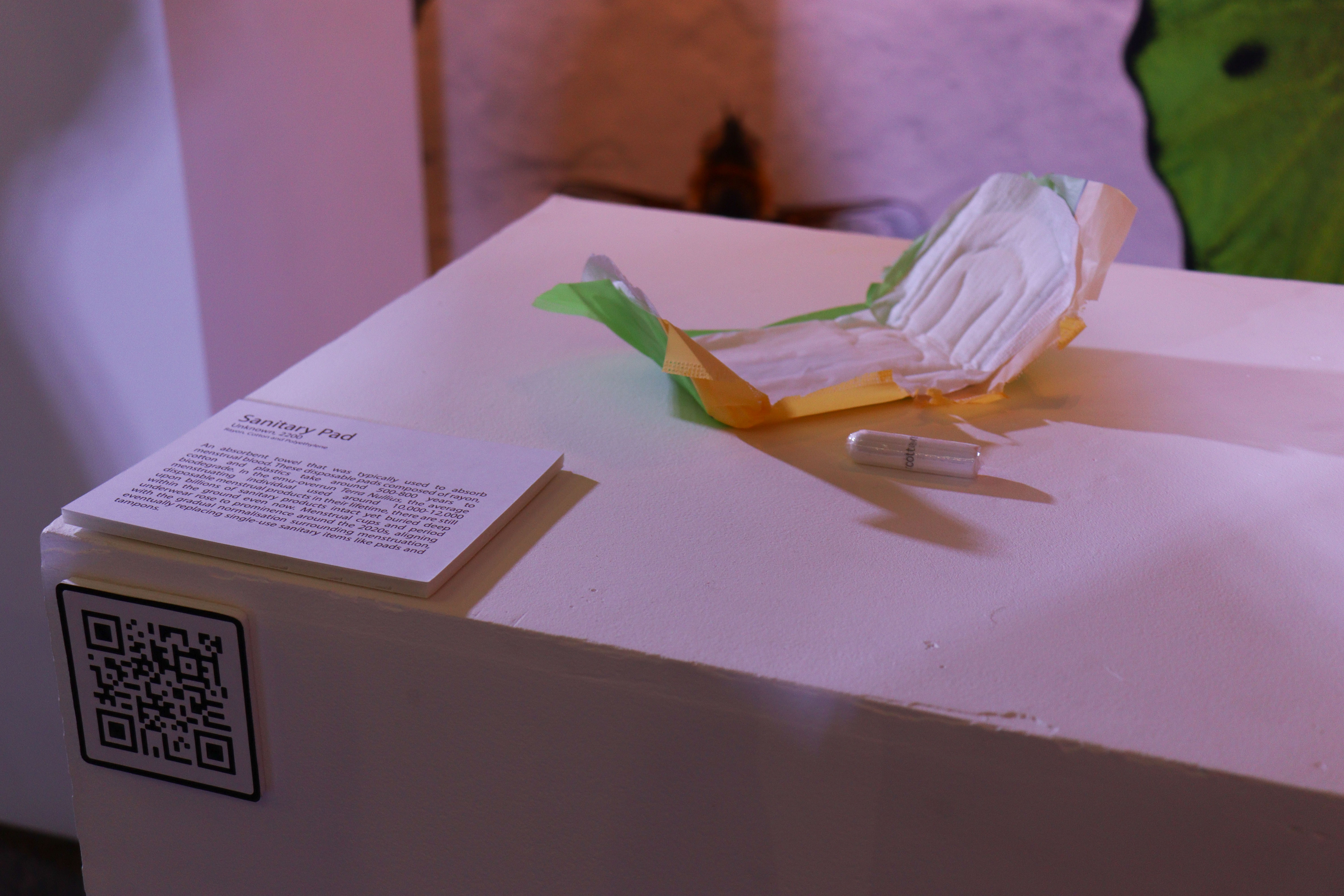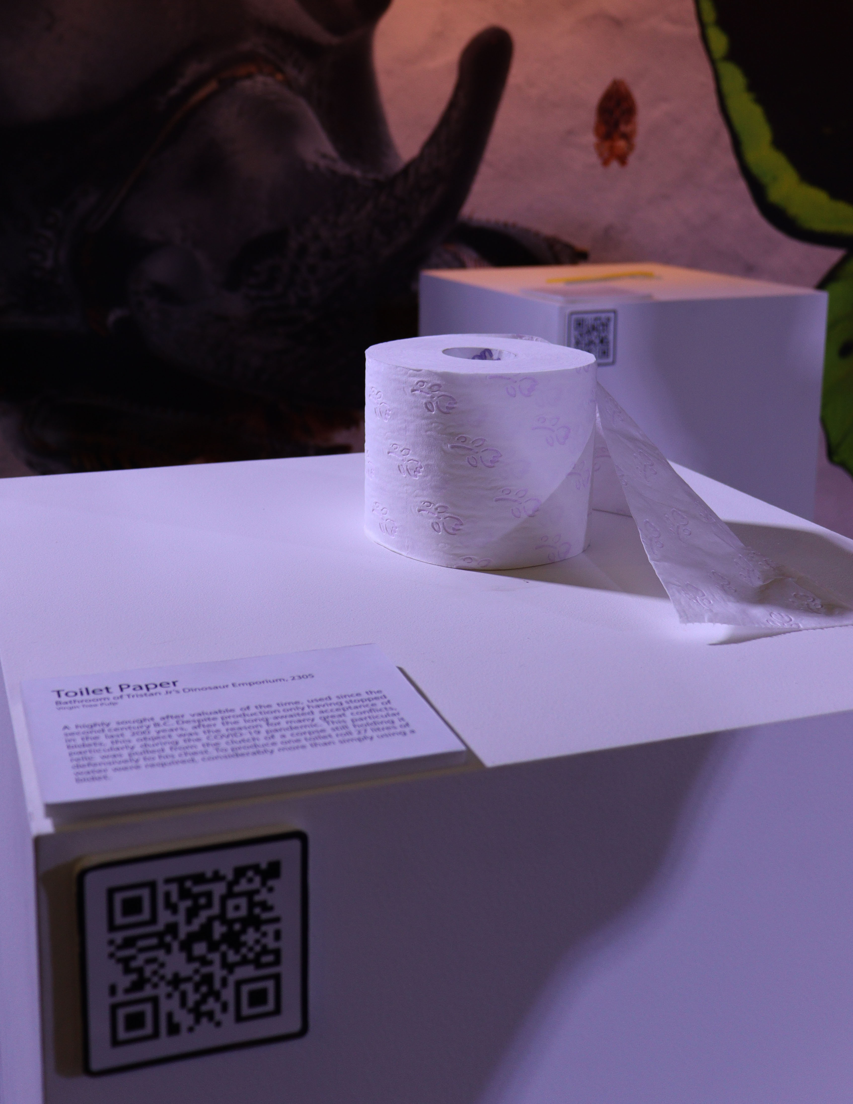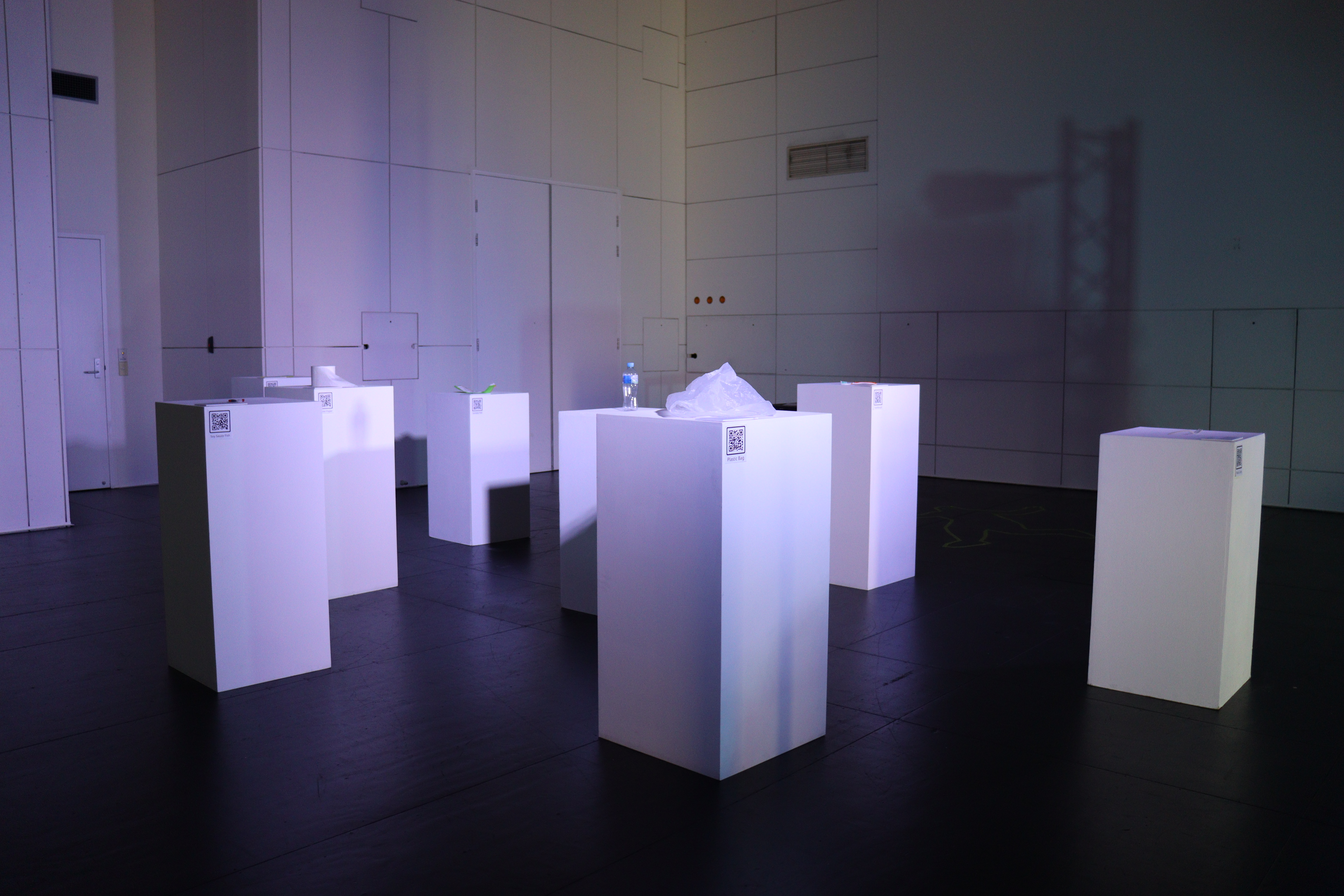 For the second physical section of our installation, we had planned to collect some everyday single-use items that we thought would be ridiculed in the future. We did research on small plastic items that do big damage to the environment and we presented them in a satirical form. I wrote some of the didactics that we placed on the plinths and recorded my voice reading them aloud to be used with the QR-Codes as we also wanted to include a hands-on element for the installation